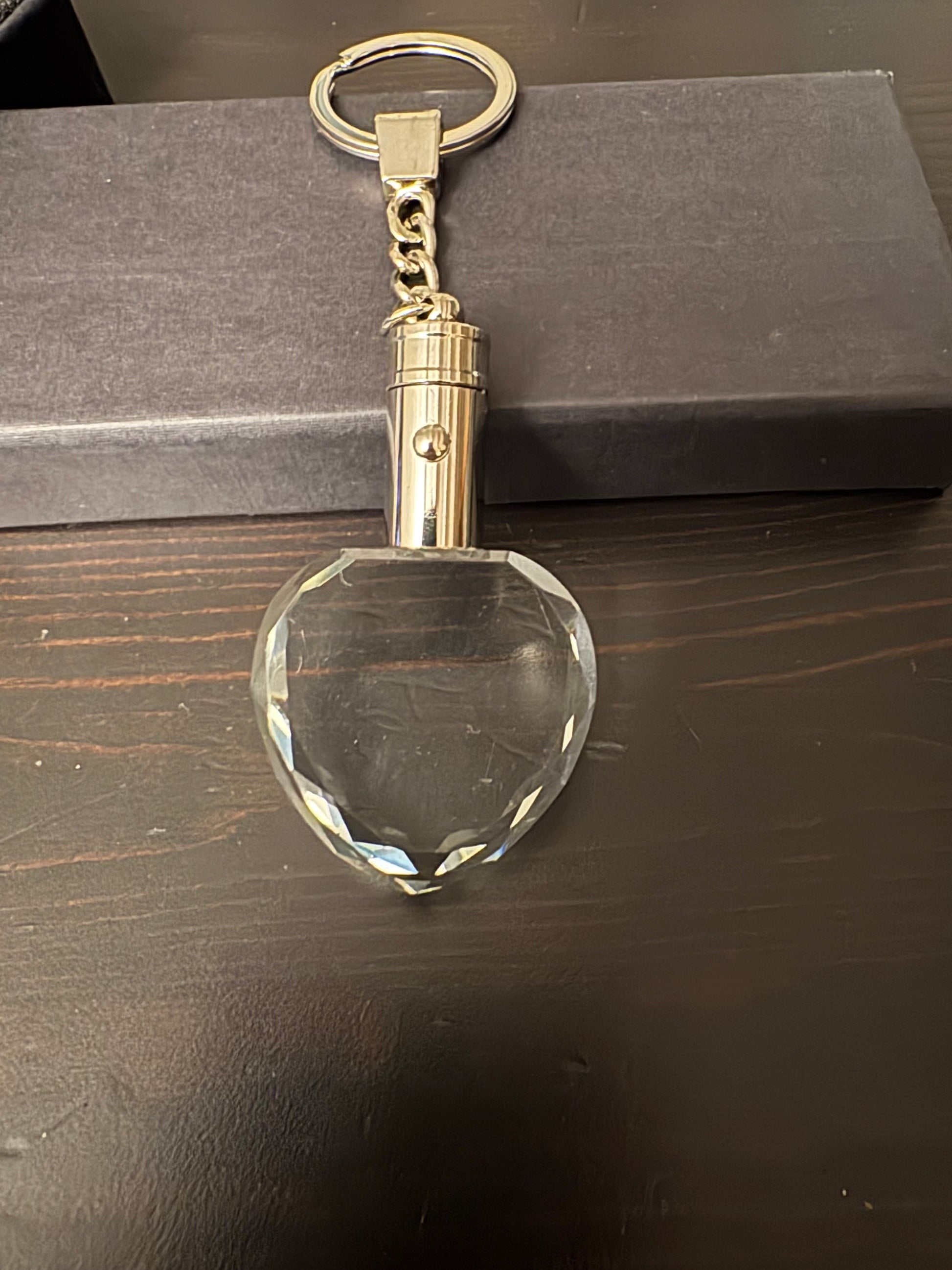 Krystallen kan lyse opp når du ønsker, og gir et romantisk uttrykk som gjør den ekstra fin i mørket. Med sin kompakte størrelse passer den lett på nøkkelknippet, vesken eller sekken – et lite personlig minne som følger hverdagen, uansett hvor den går.