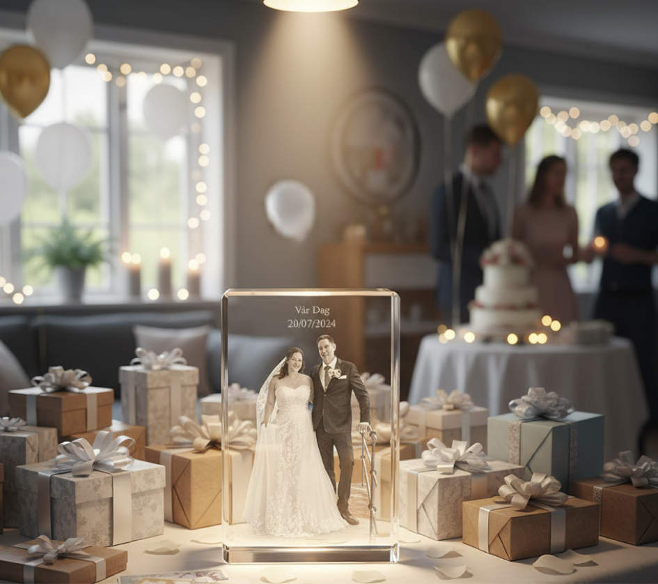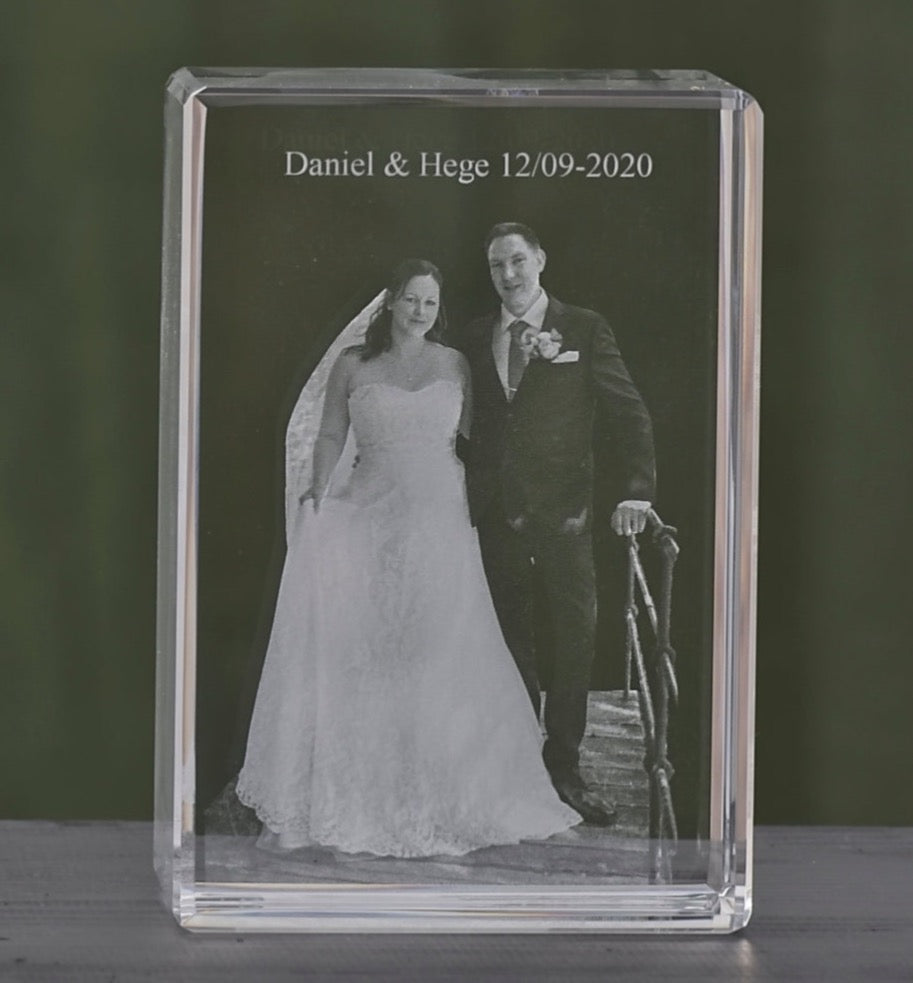 Dette er ikke bare en krystall, det er en tidløs gave med rom for personlige detaljer. Perfekt for bryllupsbilder i strålende 3D, her kan du inkludere inskripsjoner som navnene til de nygifte eller den uforglemmelige datoen.