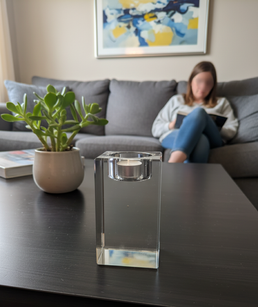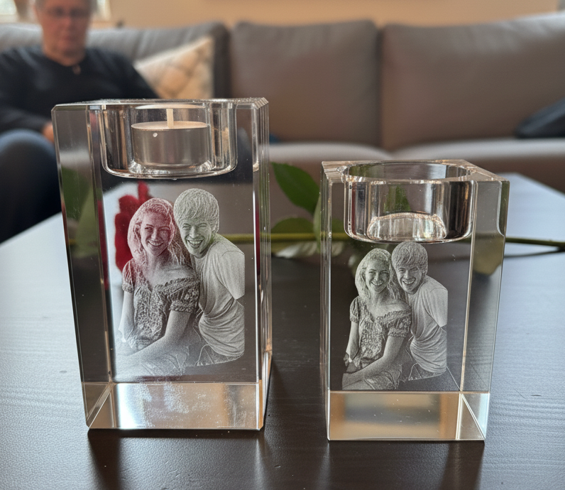 Det som gjør denne telysholderen ekstra spesiell, er at du kan få ditt helt eget bilde inngravert inne i krystallen. Enten du ønsker et minne av hunden, katten, kjæresten, mamma, pappa, bestemor, bestefar – eller et annet øyeblikk som betyr noe – blir det et personlig kunstverk som varer.